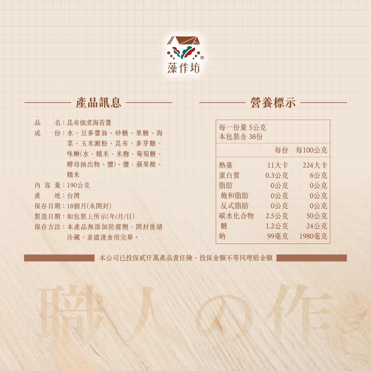 使用古早味純釀豆麥醬油慢火熬煮帶出昆布與紫菜的鮮味,味道厚實且溫潤適用於各類青菜沾醬與拌飯麵,無任何添加物大人小孩皆適宜。