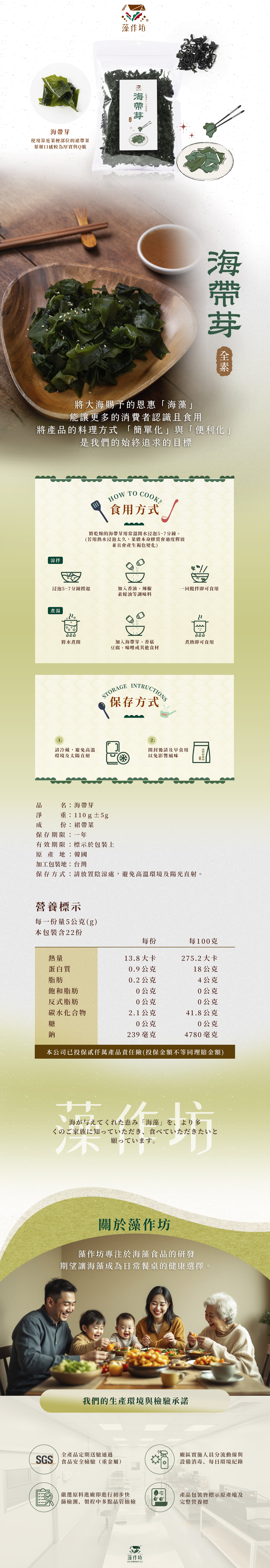 海帶芽為韓國與日本家家戶戶冰箱必備的食材,海帶芽具有豐富的營養,且富含高膳食纖維,幫助腸胃道蠕動幫助排除多於腸道內多餘毒素。