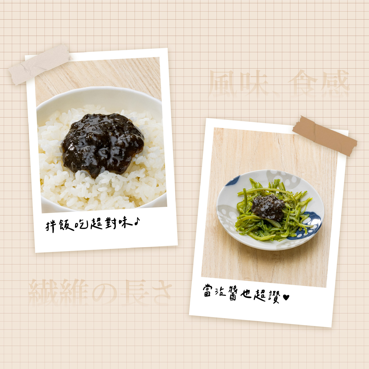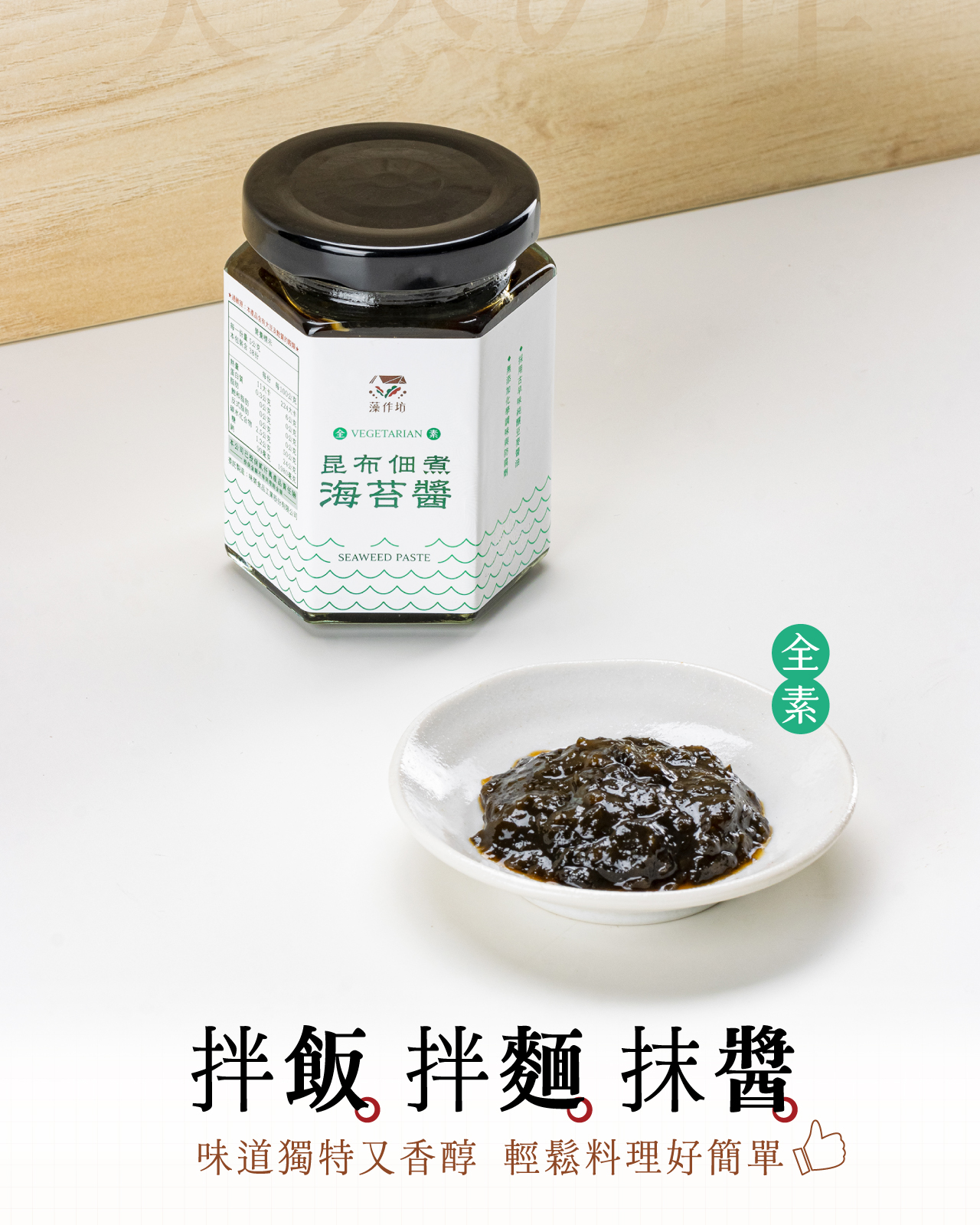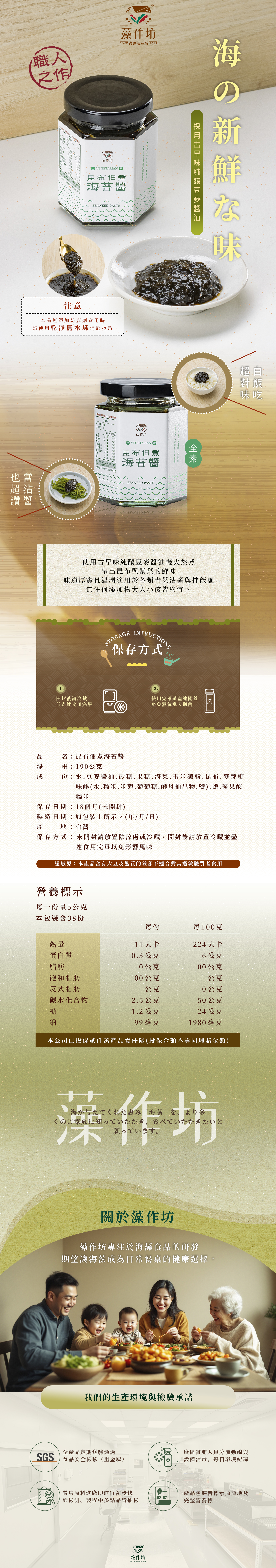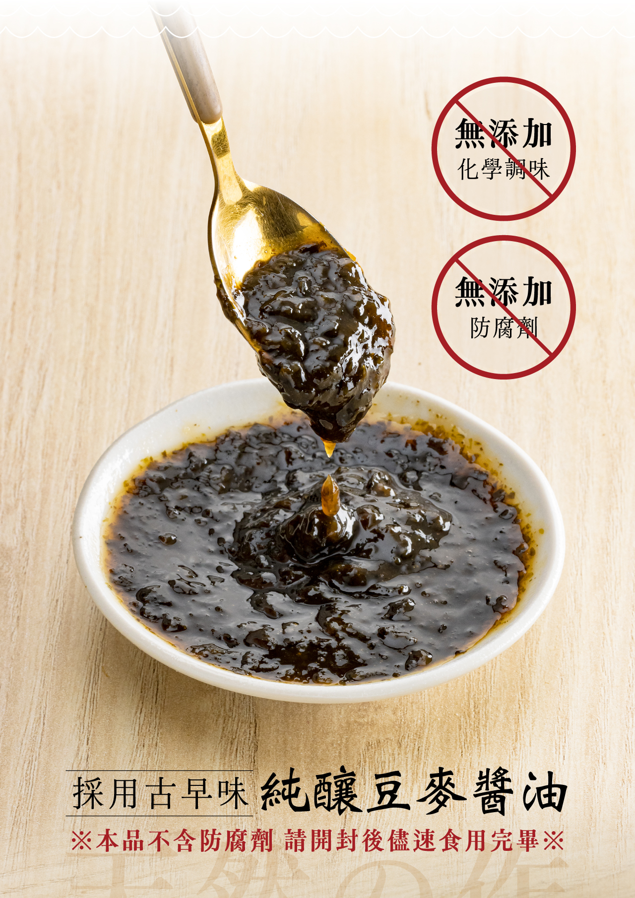 使用古早味純釀豆麥醬油慢火熬煮帶出昆布與紫菜的鮮味,味道厚實且溫潤適用於各類青菜沾醬與拌飯麵,無任何添加物大人小孩皆適宜。