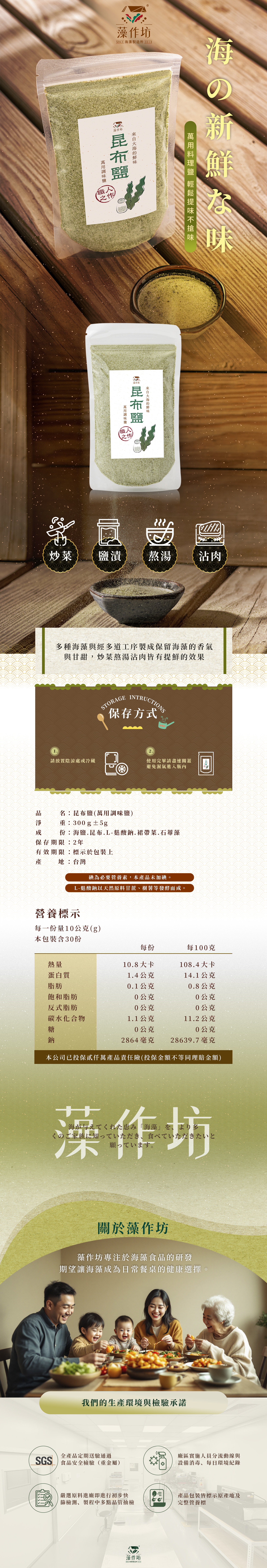 昆布鹽使用於料理前後皆可使用 例:炒菜、鹽漬、熬湯、沾肉皆可提升食材的「鮮味」